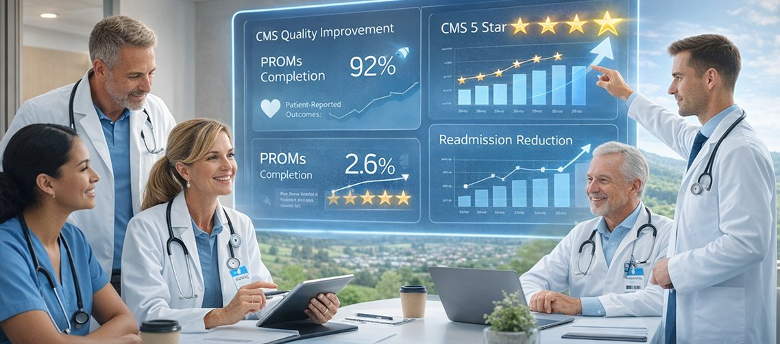 Result: PROMs orthopedics 2026 compliance >92%; functional recovery scores 18–27 points above national rural average; commercial payers increase allowed amount 9–16% on demonstrated superior outcomes.